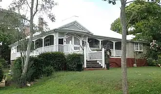 Corinda was first settled by non-indigenous people in the 1860s as a small farming community. Among the original settlers was the Francis family who in 1862 purchased 21 acres, which extended from the Brisbane River to Francis Lookout, a local heritage listed landmark on Dewar Terrace. Francis Lookout survives to this day, and includes a small burial ground opened in 1862. Its ten graves include those of some of the pioneer settlers. The oldest of the graves is of Clement Francis who died in 1863. The lychgate, erected by Angela Francis, dates to 1902.[4] Most of the original older-style Queenslander homes date back to the colonial period and were built high on the hills around the lookout.