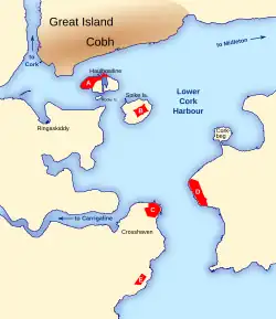The fortifications were developed throughout the 19th century[11] and a further fort, Fort Templebreedy, was added to the south of Fort Camden at the beginning of the 20th century. At the time of Irish independence, Cork Harbour was included, along with Berehaven and Lough Swilly, in a list of British naval establishments that would remain under the control of the Royal Navy, although the naval dockyard on Haulbowline Island was handed over to the Irish Free State in 1923.
