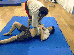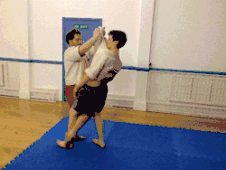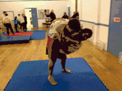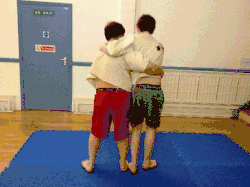 - The thrower moves their dominant foot in front of the throwee's dominant foot while pulling up the throwee's arm and tucking their dominant elbow into the throwee's armpit (keeping hold of the grips on the jacket).
