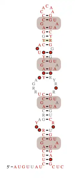 The packaging signal has a conserved RNA secondary structure featuring four AGC/GUAAU internal loop motifs.[6] Within the viral genome the packaging signal is located in the nonstructural protein 15 (nsp15) and encodes a polypeptide which is found on the surface of the nsp15 protein.[7] Deleting the packaging signal or introducing mutations that disrupt its secondary structure but not the encoded peptide lead to the loss of packaging specificity. At the same time, relocating the packaging signal to a different part of the genome did not have a negative effect on packaging.[8]