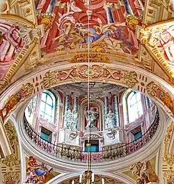 The stone Corpus Christi church was founded by Mikołaj Krzysztof "the Orphan" Radziwiłł, who decided to return it to Catholicism.[3] On August 19, 1584, he signed a document allowing the Society of Jesus to stay in the city of Nesvizh.[4] The architect Giovanni Maria Bernardoni was invited to head the construction of the collegium and the church. He was inspired by the Church of the Gesù in Rome. However, he died in Kraków in 1605 and the dome of the Nesvizh church was completed by his apprentice Giuseppe Brisio. The nave is 17.8 m (58 ft) high and the dome is almost two times higher. The frescoes widely used compositions by Peter Paul Rubens. The first mass was chanted on November 1, 1593.[5][6]
