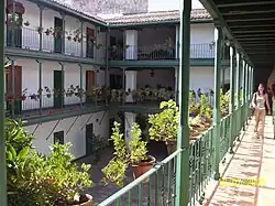 The first permanent theater of this type, Corral de la Cruz, was constructed in Madrid in 1579. The number of theaters increased rapidly after 1600, responding to the public's enthusiasm for this new form of entertainment.[2] The oldest surviving corral, albeit significantly altered, is the Corral de comedias de Alcalá de Henares. This corral, formerly a courtyard theatre, has been roofed and used as a teatro romántico and a cinema, leading to major changes in the building's architecture.[3] The last known such courtyard theatre to be built in Spain, Corral de comedias de Almagro, in Almagro, Castile-La Mancha, is a purpose-built theater that dates to 1628.[4] This only functioning courtyard theater still standing, once one among the many, [5] annually celebrates the Festival Internacional de Teatro Clásico (International Classical Theatre Festival);[2]