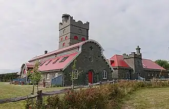 On the east side of the courtyard was a stable block, which incorporates a smaller tower, again battlemented.[4] The north and west sides of the courtyard were the barn and cart shed, which are less elaborately decorated.[4] The southern boundary wall is decorated by the insetting of pebbles taken from the nearby coastline,[5] and is accessed by a gabled gateway with ball finials.[4] In the west corner of the enclosure is a small battlemented tower, which housed a weighbridge and was also used as a tool shed.[1][4]