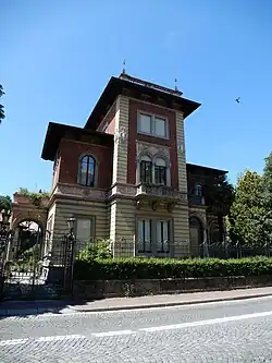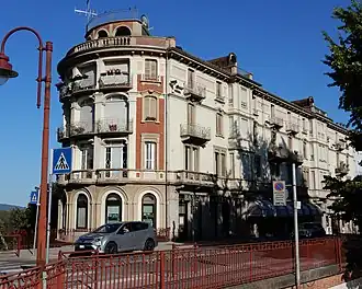 Shortly after its construction, the avenue became the most popular route to enter Ivrea, replacing the road that passes through the Borghetto quarter and reaches the city via the old Ponte Vecchio.[1] At the same time, the cultivated lands on either side of the new road, enhanced by the construction, the traffic around the railway station, and the panoramic position overlooking the river and the city center,[1][3] were developed with new and elegant villas. Among the first were Villa Luisa, built by the Borgetti family in the 1860s, and Villa Demaria in 1897.[1][3] The appearance of this section of the avenue changed drastically between 1906 and 1909 when Palazzo Ravera was built on the steep terrain overlooking the river to the east of the road.[1][3]