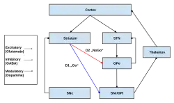 - ^ a b Silkis, I. (1 January 2001). "The cortico-basal ganglia-thalamocortical circuit with synaptic plasticity. II. Mechanism of synergistic modulation of thalamic activity via the direct and indirect pathways through the basal ganglia". Bio Systems. 59 (1): 7–14. doi:10.1016/S0303-2647(00)00135-0. ISSN 0303-2647. PMID 11226622.