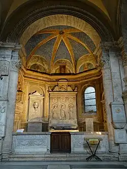 The third original monument is the tombstone (in the floor) of Archbishop Giorgio Bracharin by the workshop of Antonio del Pollaiuolo (end of 15th century). The tombstone is undated. The Archbishop lies in full robes, his hands crossed. The relief is very deep and a rich spiral border runs around the slab.[4]