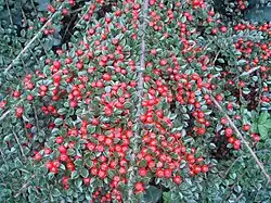 Cotoneaster atropurpureus, the purple-flowered cotoneaster,[1] is a species of flowering plant in the genus Cotoneaster of the family Rosaceae, native to the Hubei province of China. It is a prostrate, deciduous shrub growing to 2.5 metres (8 ft 2 in) wide. It can be used as groundcover or trained to ascend up a wall or other support. Its fan-shaped, arching branches bear small, rounded, glossy green leaves turning purple in autumn. Red/black flowers are followed by small, globose, scarlet fruits (pomes).[2][3]