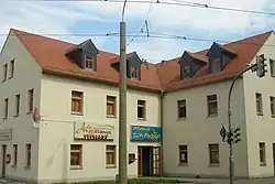 The historic Cotta village center, comprising Altcotta and Hebbelstraße, still includes five buildings constructed prior to the Gründerzeit building boom. Only the outer walls of a few other old houses, such as the Faustian winery, have survived. The former winery, located at Hebbelstraße 26 and built shortly after the Seven Years' War in 1764, features a round-arched gate and comprises several sub-buildings. Several old inscriptions on the building's history are attached to small plaques on the street-facing façade.[25] Although the winery has deteriorated over the last few decades, there are plans to rebuild it.