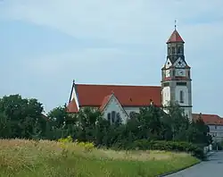 The Catholic Marienkirche is situated on a hill at the intersection of Klaus-Groth-Straße and Gottfried-Keller-Straße. The two-nave building was designed in the historicism architectural style by Paderborn cathedral master builder Arnold Güldenpfennig and constructed in 1906 under the direction of Dresden architect Heino Otto.[10] It features a laterally positioned square tower and octagonal superstructure. Above the high altar, Josef Goller created the stained glass. Although the name of the church and parish office is Unserer Lieben Frau, it is more commonly referred to as Marienkirche. Since 1991, the parish has been administered by the Steyl missionaries.[22]