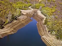 Completed in 2013, the enlarged Cotter Dam comprises a new 87-metre (285 ft) high roller compacted concrete dam wall built downstream from the old 26-metre (85 ft) high dam wall, along with two auxiliary embankment dam walls along low-lying adjoining valleys. Constructed on rock foundations by an Abigroup / John Holland joint venture, with engineering design by GHD, the main dam wall is 330 metres (1,080 ft) long, with the two rockfill embankments 340 metres (1,120 ft) and 300 metres (980 ft) long and 15 metres (49 ft) and 18 metres (59 ft) high respectively, both with internal earthen cores.[1] The enlarged dam walls increased the storage capacity of the Cotter Reservoir from the previous 3.9 gigalitres (860,000,000 imp gal; 1.0×109 US gal) to 78 gigalitres (1.7×1010 imp gal; 2.1×1010 US gal).[3]