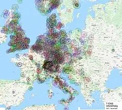 T-DAB transmitters and coverage areas in Europe, in December 2021