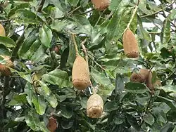 They are large trees, often rising above the rainforest canopy. The leaves are evergreen, alternate, simple, elliptical, up to 15 cm long, with a serrate to serrulate margin. Vernation lines parallel to the midvein are often visible - a very unusual characteristic. The fruit is 6–15 cm long, and roughly conical. A central plug drops out at maturity, releasing the winged seeds to be dispersed by wind. The fruit of Cariniana may be distinguished from those of Couratari, as the former have longitudinal ridges, whereas the latter bears a single calyx-derived ring near the fruit apex.[4][5]