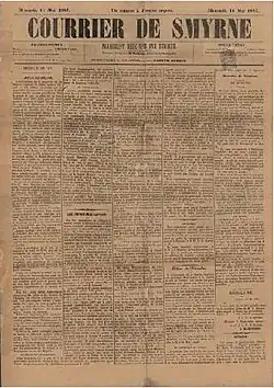 Courrier de Smyrne was Francophone newspaper of İzmir which was published from 1824 to 1905, usually twice a week.[1] Successive editors were Alexandrer Blacque (1824), Reggio Gaston, in 1893 and Jules Regio in 1905.[2] Besides politics, the newspaper contained commercial and literary issues, some of which can be found in the National Library of France.[3]