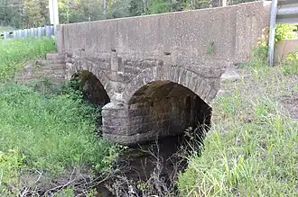 The Cove Creek Tributary Bridge is a historic bridge in rural Logan County, Arkansas. It is a two-span closed-spandrel stone arch bridge, carrying Arkansas Highway 309 across a tributary of Cove Creek north of Corley in Ozark-St. Francis National Forest. Each of its arches is 11 feet (3.4 m) long, and the structure is an overall 23 feet (7.0 m) in length. Concrete barriers form the sides of the bridge on either side of the roadway. The bridge was built in 1936 under the auspices of the Arkansas Highway Commission.[2]