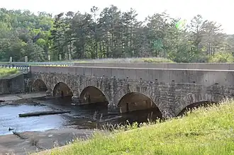 The Cove Lake Spillway Dam and Bridge are historic structures in Ozark-St. Francis National Forest, north of Corley, Arkansas. The dam is built of earth and stone, and impounds Cove Lake, location of a recreation area in the national forest. The bridge is a five-span masonry arch structure, built across the dam spillway, where it carries Arkansas Highway 309. The dam and bridge were built in 1937 with funding from the Works Progress Administration, and is a fine example of the Rustic architecture WPA projects were known for.[2]