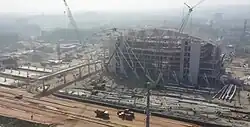 The Bangladesh Government planned to extend the rail track from Dohazari of Chittagong to Gundum of Bandarban. The trans-Asian railway network was to be connected to the proposed Ghumdhum railway station. The government also planned to build another railway track from the proposed Ramu railway station to Cox's Bazar to make another railway station in Cox's Bazar, in order to boost tourism in the city.[3] The new railway line extended to Ghumdhum[4] and proposed railway station in Cox's Bazar is being built simultaneously. Construction started in August 2017.[5] The architect of the station, Mohammad Foyez Ullah, took inspiration from the shape of an oyster for its exterior,[6] which symbolizes the beach.[7] The foundation stone of the station building was laid on 14 January 2021.[8] Its construction cost is Tk 214 crore. In January 2022, the construction of the railway station was 45% complete.[9] Another 40% of the construction work was completed in March 2023.[6]