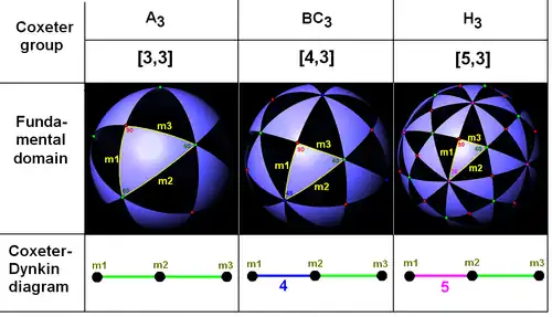 These visualizations show the fundamental domains for 2D and 3D Euclidean groups, and for 2D spherical groups. For each, the Coxeter diagram can be deduced by identifying the hyperplane mirrors and labelling their connectivity, ignoring 90-degree dihedral angles (order 2; see footnote [a] below).
