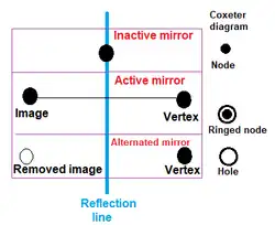 The Coxeter–Dynkin diagram can be seen as a graphic description of the fundamental domain of mirrors. A mirror represents a hyperplane within a spherical, Euclidean, or hyperbolic space of given dimension. (In 2D spaces, a mirror is a line; in 3D, a mirror is a plane.)