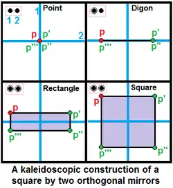 Two orthogonal mirrors can be used to generate a square, , seen here with a red generator point and 3 virtual copies across the mirrors. The generator has to be off both mirrors in this orthogonal case to generate an interior. The ring markup presumes active rings have generators equal distance from all mirrors, while a rectangle can also represent a nonuniform solution.