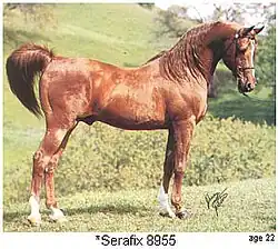 Many major Arabian sires worldwide show a strong Crabbet influence in their bloodlines. Polish and Russian bloodlines have a Crabbet influence through the Skowronek son and Mesaoud grandson Naseem, and his son Negatiw (or Negativ). Mesaoud himself was sold to Russia in 1903. Spanish bloodlines have a Crabbet influence through the stallion Nana Sahib and others. Even major historic "Egyptian-bred" sires such as Nazeer trace to Mesaoud through his Crabbet-bred grandson, Sotamm. The Crabbet-owned stallion Raktha, sire of Serafix, was exported to South Africa in 1951, along with several other Crabbet horses. The first Crabbet stallion imported to Australia was Rafyk, who was imported, along with two Crabbet mares, in 1891.[12] Today, Australia now has a significant number of "pure" Crabbet lines, undiluted by infusions from other sources,[13] with possibly the highest percentage of straight-and high-percentage Crabbet blood in the world.[14]