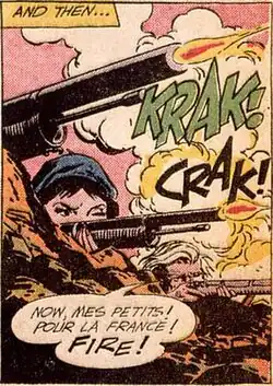 The screen-printed poster image presents a beret-clad woman shooting a rifle. Lichtenstein recomposed the comic book source — from a story written by Bob Haney and illustrated by Jack Abel[6] in Star Spangled War Stories #102 (Apr./May 1962) — by replacing the mound of sand with what seems to be a stack of sandbags. He also isolated the figure by cropping the foreground and background elements.[7]