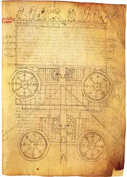 One of the drawings of the Anonymous of the Hussite Wars shows a boat with a pair of paddle-wheels at each end turned by men operating compound cranks (see above). The concept was much improved by the Italian engineer and writer Roberto Valturio in 1463, who devised a boat with five sets, where the parallel cranks are all joined to a single power source by one connecting-rod, an idea also taken up by his compatriot Francesco di Giorgio.[46]