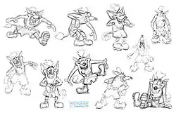 Epoch Ink artist Joe Pearson and American Exitus artist Charles Zembillas were hired and met with Naughty Dog weekly to design and develop Crash and the other characters of the game.[1][13] Zembillas' initial sketches of Crash depicted him as a "squat, hunkered-down" character. After Pearson drew a version of Crash that was leaner, had a larger nose and wore a Zorro-like mask, Zembillas began drawing Crash as "a little more manic and insane".[14] Naughty Dog decided early on that there would be no connection between a real animal and Crash's final design, which would instead be determined "51% by technical and visual necessity and 49% by inspiration". Gavin determined Crash's fur color by creating a list of popular characters and their colors, and then making a list of earthly background possibilities (such as forests, deserts, beaches, etc.). Colors that would not look good on the screen were strictly outlawed, such as red, which would bleed on older televisions. Orange was selected by process of elimination.[3] Crash's head was made large and neckless to counter the low resolution of the screen and allow his facial expressions to be discernible.[3][12] Jason Rubin noted the increased difficulty in turning Crash's head with this type of design.[3] Small details such as the gloves, the spots on Crash's back and a light-colored chest were added to help the player determine what side of Crash was visible based on color.[3][12] Crash was not given a tail or any flappy straps of clothing due to the PlayStation's inability to properly display such pixels without flickering. The length of Crash's pants was shortened to keep his ankles from flickering as they would with longer pants. Andy Gavin owns the original ink sketches of Crash by Charles Zembillas.[3] Crash was originally written by Pearson as a speaking character who, as a result of his subjection to the Cortex Vortex, communicated in a series of bizarre non sequiturs derived from classic literature and pop culture.[15][16] The team ultimately decided that Crash would be mute because they considered past voices for video game characters to be "lame, negative, and distract[ing] from identification with them".[3]