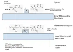 At the onset of exercise phosphocreatine is broken down to provide ATP for muscle contraction. ATP hydrolysis results in products of ADP and inorganic phosphate. The inorganic phosphate will be transported into the mitochondrial matrix, while the free creatine passes through the outer membrane where it will be resynthesised into PCr. The antiporter transports the ADP into the matrix, while transporting ATP out. Due to the high concentration of ATP around the mitochondrial creatine kinase, it will convert ATP into PCr which will then move back out into the cells cytoplasm to be converted into ATP (by cytoplasmic creatine kinase) to be used as energy for muscle contraction.[4]