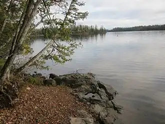 Crescent Lake lies to the south of the Boundary Waters Canoe Area ("BWCA"), along Forest Route 170.[3] To the north, Crescent Lake receives water from Kinogami Lake,[4] through Willow Creek, in the Willow Creek Unit, a 1360 acre roadless area inventoried by the Forest Service's second Roadless Area Review & Evaluation (RARE II) in 1979, but not added to the BWCA.[5] To the east, Crescent Lake is connected to Bouder Lake by a shallow, but navigable channel,[6] and also drains Lichen Lake.[7] To the south, Crescent Lake empties through a series of small lakes into Rice Lake which in turn drains into the Poplar River and ultimately into Lake Superior.[7][8]