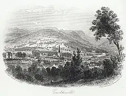 The name Crickhowell is an anglicised spelling that corresponds to the Welsh Crucywel. The name is derived from Crug Hywel, meaning 'Hywel's mound'. This is usually identified with the Iron Age hill fort on nearby Table Mountain, although this has the local name of Mynydd y Begwn. It may be that Crug Hywel refers to the castle mound in the town itself.[3] The language of Crickhowell (and Llangynidr) was originally Welsh. In his 1893 book Wales and her language, John E. Southall, reports that over 60% of the population of Crickhowell spoke Welsh, although the town was only a few miles from more anglicised Abergavenny.[4]