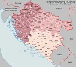 The army of the Independent State of Croatia was organized in November 1944 to combine the units of the Ustaše and Croatian Home Guard into 18 divisions, comprising 13 infantry, two mountain, two assault and one replacement Croatian divisions, each with its own organic artillery and other support units. There were also several armoured units, equipped in late 1944 with 20 Pz IIIN and 15 Pz IVF and H medium tanks.[14] From early 1945, the Croatian divisions were allocated to various German corps and by March 1945 were holding the Southern Front.[8] Securing the rear areas were some 32,000 men of the Croatian Gendarmerie (Hrvatsko Oruznistvo), organised into five police volunteer regiments plus 15 independent battalions, equipped with standard light infantry weapons, including mortars.[15]