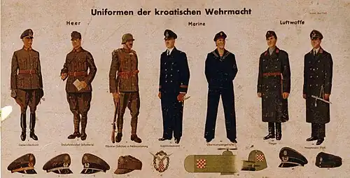 The Croatian Home Guard also included an air force, the Air Force of the Independent State of Croatia (Zrakoplovstvo Nezavisne Države Hrvatske, or ZNDH), the backbone of which was provided by 500 former Royal Yugoslav Air Force officers and 1,600 NCOs with 125 aircraft.[7] By 1943, the ZNDH was 9,775 strong and equipped with 295 aircraft.[8]
