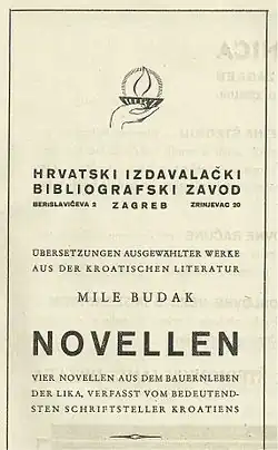 The Institute published the Dictionary of Croatian Literary Language, as well as taking over the publishing of the Croatian Encyclopedia.[4] In 1942, the institute published seven of Vladimir Nazor's works: Putopisi, Zagrebačke novele, Posljednja Trijada, Na vrh jezika i pera, Arhanđeli, Knjiga pjesama and Eseji i članci.[5]