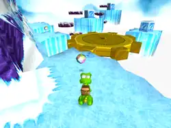 The main goal of each level is to navigate through the stage and reach the gong located at the end of the level in order to transport Croc to the next, while also saving as many captured Gobbos imprisoned throughout the stage as possible. Certain stages also contain boss enemies known as "Guardians" that Croc must defeat in order to progress to the next stage.[4] Various different collectibles are scattered throughout stages, including small, gray crystal orbs that act as Croc's health, and red hearts that give the player an extra life when collected.[4] Also hidden across each stage are 6 Gobbos being held captive by the Dantini tribe that act as Croc's main objective throughout the length of the game.[4] 5 of these Gobbos are hidden in various locations throughout the level, often collected by solving a puzzle or completing a challenge, whilst the 6th Gobbo is located in a bonus room hidden behind a set of doors that can only be reached by collecting 5 colored crystals hidden throughout the level.[5] Rescuing every Gobbo before a boss level in each world unlocks a secret level that can be completed in order to collect a jigsaw puzzle piece.[4] Subsequently, collecting every puzzle piece in the game unlocks an extra island containing more levels for the player to progress through. While collecting the Gobbos is not mandatory to completing the game, doing so is nonetheless necessary in order to face off against the game's final boss and unlock the game's true ending.