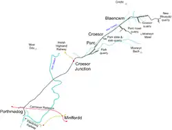 The section from Croesor Junction to the slate quarries will probably never re-open as the quarries have long since closed. However the part of the Croesor tramway that ran from Croesor Junction to Porthmadog has been rebuilt as part of the resurrection of the Welsh Highland Railway from Caernarfon to Porthmadog. The section between Croesor Junction and Pont Croesor opened in May 2010. The section from Pont Croesor to Porthmadog reopened on 8 January 2011,[2] whereby it linked up with the Ffestiniog Railway to allow through trains to Blaenau Ffestiniog railway station via the Porthmadog cross town link.