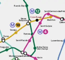 Croix-Rouge station (French pronunciation: [kʁwɑ ʁuʒ]) was the first terminus of Line 10 of the Paris Métro. It opened in 1923, but closed in 1939. The station was situated in the 6th arrondissement of Paris, between Sèvres–Babylone and Mabillon.