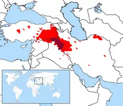 Kurdish-speaking territories in red, with official status of the Kurdish language alongside Arabic in dark red in Iraqi Kurdistan
