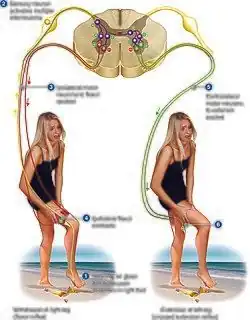 The crossed extensor reflex or crossed extensor response or crossed extension reflex is a reflex in which the contralateral limb compensates for loss of support when the ipsilateral limb withdraws from painful stimulus in a withdrawal reflex.[1] During a withdrawal reflex, the flexors in the withdrawing limb contract and the extensors relax, while in the other limb, the opposite occurs as part of the crossed extensor reflex. To provide a more clear explanation, this opposite occurrence means one limb with perform flexion at the hip and knee with the extensors relaxed, while the other limb will perform extension at the hip and knee while flexors are relaxed.[2] Besides shifting the body weight to the other side, the reflex pathway is also associated with leg coordination when walking by flexing muscle on one side, while extending muscle on the other side.[1] This crossed extensor response is properly part of the withdrawal reflex.[3]