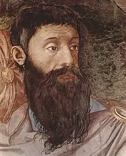 Portraits of donors, political figures, and artists embedded in religious works were common in sixteenth-century Florence. It appears that three of the men surrounding Moses in the right foreground are portraits. Only one has been positively identified. The man with the long dark beard portraying the priest Eleazar is Pierfrancesco Riccio who served as both Cosimo's secretary and a priest at the Florence Cathedral.[20] The man in the red turban is a scholar based on the black coif under the turban, and his Florentine identity is thought to be the writer Pier Francesco Giambullari. The man in blue who is looking out of the fresco at the viewer might be a self-portrait of Bronzino.[21] It has also been posited that the man kneeling in front of Moses in the right foreground is Eleanor's father, Don Pedro de Toledo.[22]