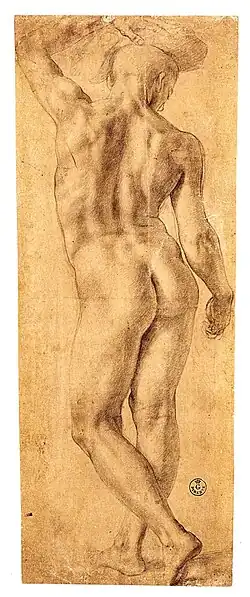 Bronzino's arrangement of the Hebrews in the foreground demonstrates his mannerist penchant for appropriating classical sculptural subjects in his works. The seated nude on the right is shown in the classic reclining pose of a river god.[9] The semi-nude youth on the left with his back to the viewer contorts his body to grip the arm of a seated female while holding a bundle of unleavened bread on his head. The same youth can be seen reaching the far shore in the background of the fresco.[7] Bronzino's study of a standing nude in the Uffizi was thought to be the work of Bronzino's teacher, Pontormo, until the 20th century.[3] It is clearly a preparatory chalk drawing for the standing figure with the bundle on his head. His exaggerated thrust of the hip and raised arm are common mannerist motifs and one leg crossed behind the other is a signature pose of Bronzino's. The figure in the center leaning on a rock is shown with his legs similarly crossed.[10] The standing figure's stance appears to be inspired by a Roman copy of a Greek bronze statue known as the Idolino. It was unearthed in a 1530 excavation at the Villa Imperiale of Pesaro where Bronzino was working at the time. Bronzino has replaced the gentle contrapposto of the ancient sculpture with a more artificial pose that is decorative and stylish.[1][9]