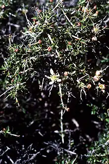 The species is a shrub that grows up to 1–2 metres (3.3–6.6 ft) tall. It is intricately divided into thorn-tipped branches lined with clusters of small, deciduous, gray-green leaves no longer than about 1.5 centimeters. The inflorescence bears a single flower, which has 5 white to purple-tinged petals about a centimeter long and narrowing to claws at their bases.[2]