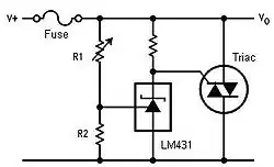 In the following example crowbar circuit, the LM431 adjustable zener regulator controls the gate of the TRIAC. The resistor divider of R1 and R2 provide the reference voltage for the LM431. The divider is set so that during normal operating conditions, the voltage across R2 is slightly lower than VREF of the LM431. Since this voltage is below the minimum reference voltage of the LM431, it remains off and very little current is conducted through the LM431. If the cathode resistor is sized accordingly, very little voltage will be dropped across it and the TRIAC gate terminal will be essentially at the same potential as MT1, keeping the TRIAC off. If the supply voltage increases, the voltage across R2 will exceed VREF and the LM431 cathode will begin to draw current. The voltage at the gate terminal will be pulled down, exceeding the gate trigger voltage of the TRIAC and latching it on, "sinking" excessive current from V+ — Vo line to GND.