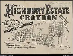 The first developments were on the northern side of the station around Edwin and Elizabeth Streets. Anthony Hordern built his grand home 'Shubra Hall' in 1869 while many of the shops along Edwin Street North were built in the 1880s. Many houses in the areas surrounding Edwin Street North and Elizabeth St are also of the Victorian style popular in the 1880s and 90s.[8] The 1880s and 90s also saw the establishment of the suburbs first schools with Croydon Public School in 1884,[11] and the Presbyterian Ladies' College relocating from Ashfield in 1891.[12]