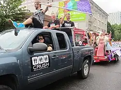Crush's logo featured images of two men holding hands, a woman and a man holding hands, as well as two women holding hands.[1][2] The bar had unisex public toilets.[2] In his 2019 "overview of Portland's LGBTQ+ nightlife for the newcomer", Andrew Jankowski of the Portland Mercury wrote: "Crush is among Portland’s coziest, most queer-friendly bars, and is presently Southeast Portland’s only LGBTQ+ bar. Crush offers a foodie-friendly menu, crafted cocktails, sidewalk patio, burlesque-drag revues, stand-up comedy shows, nonbinary concerts, and pants-free dance parties."[3]