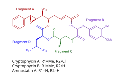 Cryptophycins were originally discovered in 1990 in cyanobacteria of the genus Nostoc.[1] Cryptophycins were patented as antifungal agents with an unknown mechanism of action and subsequently identified as microtubule inhibitors.[2] Closely related molecules were reported in the marine sponge Dysidea arenaria, which were first given the name arenastatins.[3] However, since cyanobacteria are common symbionts of sponges, it has been suggested that bacteria may be the true origin in cases where sponge and bacterial metabolites closely resemble one another.[4] Nevertheless, study of the structure-activity relationships between the two subgroups of molecules led to improved understanding of their cytotoxic effects.[5]: 230