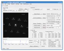 DiffractGUI allows for an automated analysis of diffraction patterns and high-resolution images of single crystal or limited number of crystallites. It is able to determine crystal orientation, index individual diffraction spots and measure interplanar angles and distances in picometric precision.[20] The input image may depict: