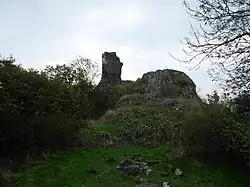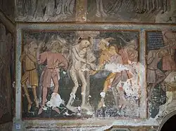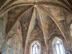 The church of Restér was built in the late 13th century, which is shown by the main nave ending in a square shape. It was dedicated to St. Andrew, according to the 1332–1337 list of tithes.[85] It was heavily reconstructed in the mid-14th century, under the sons of Nicholas (I).[87] Remains of frescoes were discovered inside, which were painted in the first half of the 15th century. Alongside biblical theme, one of the fragments depicts Elizabeth of Hungary.[88]