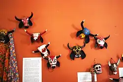 Los Diablos (the devils) is the best known Afro-Mexican dance in the Costa Chica with dancers wearing devil's mask and dancing with wild, exaggerated movements. They are attended by assistants with whips.[6] From 30 October to 1 November, the dancers leave the cemetery to dance, eat offerings of food and more. They spend three days in the streets with dance, music, and theatrical antics before “returning” to the grave. The two main dancers represent the chief of the devils called Tenango or Pancho along with his wife called La Minga, the mother of devils who also appears in other regional dances. The dance as various influences including African and Catholic. While the dance and dressing up as devils were exclusively for men, this has changed as many have left to work outside of the Costa Chica. Women and children have now participated in the annual ritual.[9] Other dances in the municipality include El Torito (the little bull), which is centered on a frame in the shape of a bull that goes through town with residents dancing around it. Versions of La Conquista and Doce Pares de Francia have unusual characters such as Hernán Cortés, Cuauhtémoc, Moctezuma, Charlemagne and Turkish horsemen. Las Chilenas are dances with erotic movements.[6]