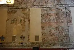 On the west side of the complex, on the south side of both the Cathedral itself and its attached cloister is the capilla abierta (open chapel). This was one of the first constructions of the Spanish built after Hernán Cortés choose Cuernavaca as a seat over his dominions. The chapel was originally bigger than what remains today. The open chapel here was used not only for Mass, but also for plays, music dance and other events designed to explain and reinforce the faith.[10] The roof of the open chapel is supported by large arches and serves as a portico to the cloister. The cloister today is used as office for the bishopric. It was restored to its former look in the 20th century, with two levels surrounding a central courtyard. The levels have corridors marked off by arches.[7] This cloister retains a number of frescos, some of which depict New Spain missionaries in the Philippines and Japan.[4] The main church has a plain facade with the only element with ornate decoration is the bell tower with also contains a clock.[6] Just inside the main portal, there is a bronze statue of Jesus carrying a cross, a lamb and a book. Just beyond this is a very large stone baptismal font.[7] Inside, the decoration is stark and mostly modern, especially in the main altar area. An equilateral cross with an image of Christ is suspended over the altar area and there are small modern crosses and other elements on the side walls. However, the most important decorative element is an 18th-century narrative mural. This mural was uncovered during the renovation work in the mid 20th century. The mural covers 400 m² of both side walls of the main nave of the church and tells the story of the arrival and martyrdom of Philip of Jesus and other missionaries in Japan.[6][11] The mural was probably painted in the middle of the 17th century after the Franciscan missionaries were beatified in 1627. The mural was painted al fresco in a primitive style. Little is known about who painted it or the socio-political context behind its creation. One scholar by the name of Luis Islas Garcia, believes that the artist was a native of Asia who resided in the monastery, assisted by local indigenous people. However, Father Diego Yuki of a museum dedicated to the martyrs in Nagasaki believes that the mural as a purely local work. Phillip of Jesus was beatified in 1627, and canonized in 1629. As the first Mexican saint, as well as a Franciscan, his story would have importance at this establishment. He would have relevance through the colonial period as a symbol of Criollo identity in Mexico. However, this mural was covered over in the 19th century and its existence was forgotten. The work was rediscovered in the 20th century by architect Ricardo Robina when the cathedral was remodeled.[11]
