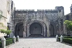 Building of the complex proper began in 1529 on land donated by Juana de Zúñiga de Cortés, Hernán Cortés's wife.[6][8] It was the fifth construction in New Spain by the order and supervised by Toribio de Benavente Motolinia. Like other monasteries of the time, it was built with large, tall, thick walls and with merlons in order to defend the new missionaries from still hostile native peoples.[5] The monastery's lands originally extended far beyond the current complex, and included large gardens and other lands used by the monks to produce food and other needed supplies.[6][8]